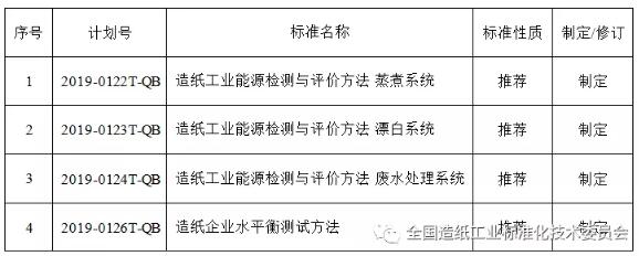 2019年6月24日,工業和信息化部發布了《關于印發2019年第一批行業標準制修訂和外文版項目計劃的通知》﹝工信廳科函(2019)126號﹞。其中,由全國造紙工業標準化技術委員會歸口管理以及中國制漿造紙研究院有限公司主要負責起草的4項節能標準位列其中,具體見下表。