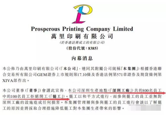 6月25日,港資上市印刷企業--萬里印刷發布公告稱,其深圳生產地的約800名員工中,有100名員工拒絕開工。罷工以和平方式進行,參與罷工的員工并無對深圳工廠的設施造成任何損害。