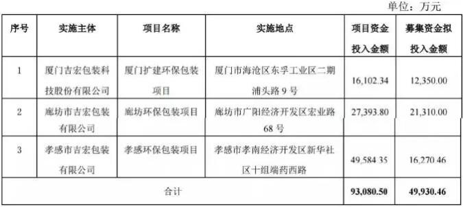 導語:7月2日,吉宏包裝審議通過《關于部分募投項目變更實施主體和實施地點的議案》,擬變更“廈門擴建環保包裝項目”部分募集資金6000萬元投入至公司位于全資子公司寧夏吉宏使用。 吉宏包裝:募集近5億元用于三大項目建設 經中國證監會出具的《關于核準廈門吉宏包裝科技股份有限公司非公開發行股票的批復》(證監許可[2018]2099號)核準,公司非公開發行A股股票25,393,699股,發行價格為20.32元/股,募集資金總額為515,999,963.68元。 2019年4月18日,公司保薦機構華創證券有限責任公司(以下簡稱“華創證券”)將扣除承銷費12,000,000.00元后的上述認購股款余額503,999,963.68元劃轉至公司指定的募集資金專戶內。上述募集資金扣除保薦費用以及其他與發行相關的直接費用4,695,393.70元后,募集資金凈額為人民幣499,304,569.98元。 本次非公開發行股票募集資金擬用于下述項目: