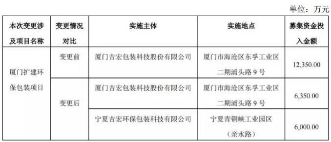 變更募集資金用途,勻出資金建設寧夏項目 吉宏包裝上述非公開發行股票募投項目中的“廈門擴建環保包裝項目”原計劃由廈門總部實施,實施地點位于廈門市海滄區東孚工業區二期浦頭路9號,項目建設生產線主要用來生產彩色包裝箱、彩色包裝紙盒及環保紙袋,項目擬投入募集資金金額12,350萬元。 現根據公司的長遠發展規劃及客戶的實際供貨需求,擬變更“廈門擴建環保包裝項目”部分募集資金6,000萬元投入至公司位于寧夏青銅峽工業園區(親水路)全資子公司寧夏吉宏環保包裝科技有限公司使用,即擬部分變更募投項目的實施主體為公司全資子公司寧夏吉宏環保包裝科技有限公司,實施地點為寧夏青銅峽工業園區(親水路)。具體情況如下: