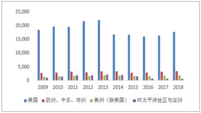 數據來源:公開資料整理 從IBISWorld公布的行業收入數據來看,美國造紙行業目前的收入規模(只包含造紙部分)約為400億美元,同時該收入規模還在逐漸減小當中。如果將統計范圍擴大到林木漿紙,則美國目前林木漿紙行業整體的市場規模約為3400億美元,且近十年來呈現出逐漸增加的趨勢。結合兩方面的數據分析,在經歷了上世紀末與本世紀初的行業兼并后,美國造紙行業步入成熟期后期,行業的業務重心已經開始從造紙本業向上下游關聯業務轉移。 美國造紙行業造紙業務營收(單位:億美元)