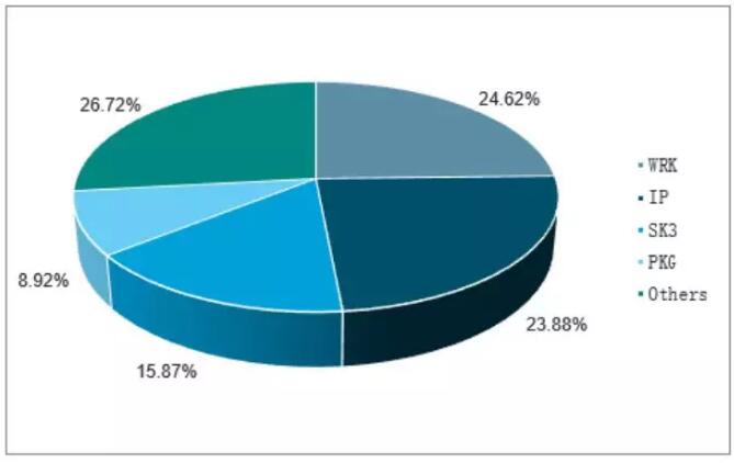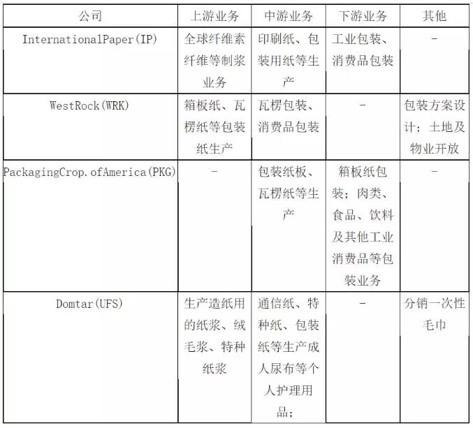 數據來源:公開資料整理 在細分紙種方面,行業龍頭的各家公司也有所不同。國際紙業(IP)是全球最大的造紙及包裝業公司,廣泛參與到造紙業務上中下游的各個環節,產業鏈非常完善,業務涉及印刷紙生產、工業包裝、消費品包裝、制漿等。近幾年來,下游的包裝業務穩定的為公司貢獻約70%的營業收入,上游的制漿業務也能貢獻約10%的營業收入;營業收入僅次于國際紙業的WestRock(WRK)是由MeadWestvaco和RockTenn合并而成,是全球領先的箱板紙和紙板制造商,業務主要集中在造紙行業的下游包裝領域,同時,公司在包裝業務之余,也提供包裝解決方案的服務; PackagingCrop.ofAmerica(PKG)是美國最大的包裝紙板生產商之一。與WestRock略有不同的是,公司業務的包裝業務除了箱板紙包裝外,還包括生產肉類、食品、飲料及其他工業消費品的大型包裝紙生產;Domtar(UFS)的業務則更偏向于上游的制漿,公司主要生產造紙用的紙漿、絨毛漿和特種紙漿,同時也涵蓋通信紙、特種紙、包裝紙等造紙類業務,此外,公司在造紙業務之余,還涉足于個人護理用品業務,如生產成人尿布、分銷一次性毛巾等。 美國造紙行業龍頭業務各有側重