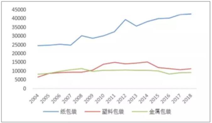數據來源:公開資料整理 可以看出,美國的龍頭造紙企業在造紙業務之外,都會往上游制漿業務或下游包裝業務拓展延伸,甚至是和造紙業務關聯度不高的其他業務。不同公司側重的業務各不相同,從而在行業內形成了各家公司自己的護城河,在一個成熟行業的細分子行業中獲取更大的市場份額、尋求突破。而各公司除了自己側重的業務之外,多元化的業務布局也有利于提升公司抗風險能力。 2、結構特征:包裝用紙成為美國造紙行業主要增長動力 。1)包裝用紙需求受經濟增長、電商業務驅動 包裝用紙的需求主要受到國家整體經濟和電商、快遞服務影響。國民經濟向好的時候,貨物產出也會相應的擴大,對包裝紙的需求就會相應的上升。2008年經濟危機以來,美國經濟的增長速度基本維持在4%左右,經濟穩步增長,因此預期這將對包裝用紙產生穩定增長的需求。與包裝用紙關系密切的快遞、電商業務方面,美國也體現出了強勁的增長?爝f業的收入規模近年來保持5%以上的增長速度,并且該增長速度還有進一步加大的趨勢。 電子商務方面,除2008-2009年受經濟危機影響外,美國的電子商務銷售規模基本保持在10%的高速增長。受快遞業、電子商務快速發展的強勁拉動,美國的紙包裝業務收入在近十年來持續增長,而與此同時,包裝業務中的另外兩大類——塑料包裝和金屬包裝的業務收入基本保持不變,增長幅度較小。因此預期美國的包裝紙市場被金屬包裝、塑料包裝替代的可能性較低。 美國各品種包裝業收入(單位:百萬美元)