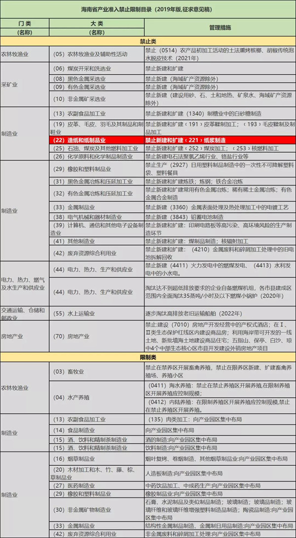 由上述目錄可以看出,造紙和紙制品行業被列入禁止類行列,未來海南省將禁止和擴建紙漿類項目。 此外,《海南省產業準入禁止限制目錄2019年版》指出,海南省行政區域內擬新增固定資產投資項目,擬新設立或新遷入法人單位、產業活動單位、個體工商戶須執行《目錄》。此外,經國家或省政府批準,需采取或享受專項政策的地區或行業按照相關政策執行;外商投資執行《外商投資準入特別管理措施(負面清單)(2019年版)》《自由貿易試驗區外商投資準入特別管理措施(負面清單)(2019年版)》。記者還獲悉,《目錄》中特別管理措施后列出的時間點,是現有存量全部退出的時間節點,如胡椒傳統泡水脫皮技術(2021年)表示須在2021年前全部退出。 此外,該《目錄》服務企業發展專項小組組長單位為省發展改革委,負責發揮統籌協調作用,組織推進各項重點工作和重點任務落實,做好年度總結、信息交流。專項小組各行業成員單位負責《目錄》相關條目的解釋、修訂等工作,認真落實專項小組會議有關議定事項,指導各市縣嚴格執行《目錄》;結合部門職能,強化標準約束,制定完善實施細則和相關配套措施,加強與專項小組其他成員單位之間的溝通協作。