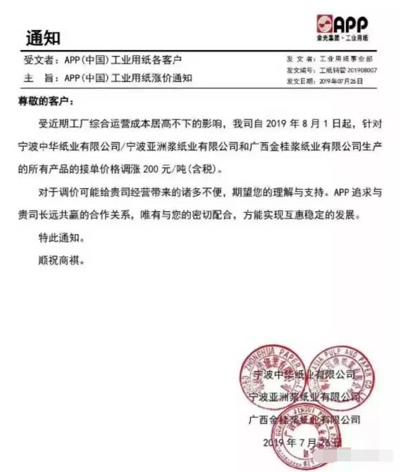 APP(中國):受近期工廠綜合運營成本居高不下的影響,我司自2019年8月1日起,針對寧波中華紙業有限公司/寧波亞洲漿紙業有限公司和廣西金桂漿紙業有限公司生產的所有產品的接單價格調漲200元/噸(含稅)。