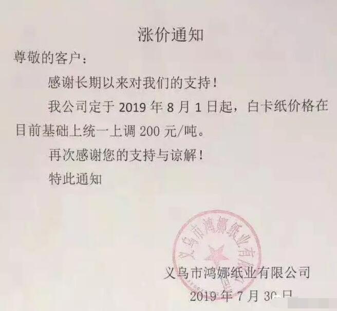 義烏市鴻娜紙業:我公司定于2019年8月1日起,白卡紙價格在目前基礎上統一上調200元/噸。