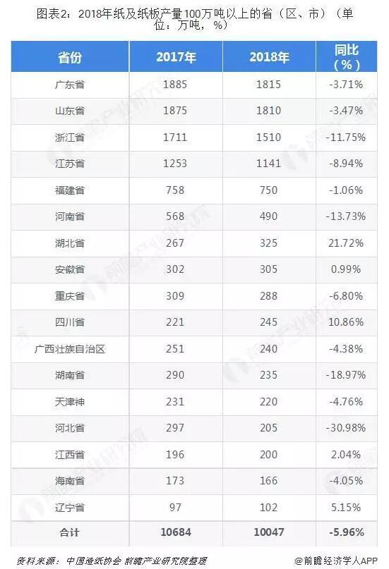 而在省份格局上,廣東、山東以及浙江為主要產區。2018年廣東、山東、浙江、江蘇、福建、河南、湖北、安徽、重慶、四川、廣西、湖南、天津、河北、江西、海南和遼寧17個省(區、市)紙及紙板產量超過100萬噸,產量合計10047萬噸,占全國紙及紙板總產量的96.28%。