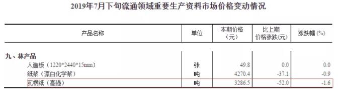 其中,高強(qiáng)瓦楞紙在7月20日-7月31日的價格為3286.5億元,比7月中旬下跌52元,同比下跌1.6%。