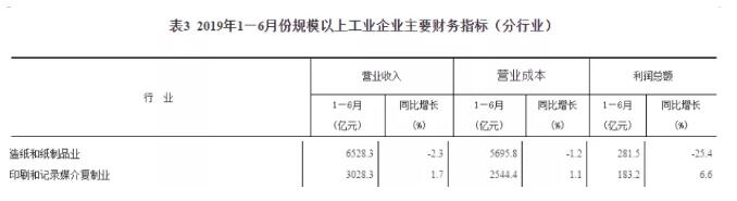 其中,造紙和紙制品業(yè)1-6月份的營業(yè)收入為6528.3億元,同比減少2.3%;營業(yè)成本為5695.8億元,同比減少1.2%;利潤總額為281.5億元,同比減少25.4%。