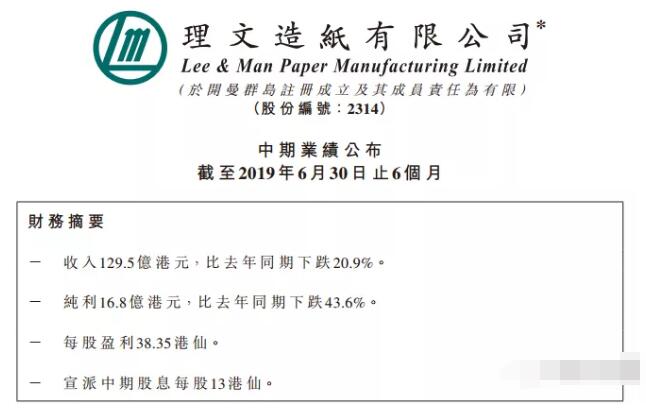 營收、利潤雙雙下跌 2019年上半年,造紙行業出現供大于求的現象,理文造紙銷售量及利潤均有所下降。截至2019年6月30日止6個月,總銷售量為281萬噸,產品平均每噸凈利潤為597港元;總收入同比下跌20.9%至129.47億港元,凈利潤下跌43.6%至16.80億港元。 理文造紙稱,業績均在集團預期之內,集團戰略目標保持不變。在原料及制成品存貨周轉期、應收賬款及應付賬款周轉期等方面,理文造紙均有所變動: 原料及制成品存貨周轉期分別為58日及26日,相比截至2018年12月31日止年度則分別為61日及16日; 應收賬款周轉期為41日,相比截至2018年12月31日止年度則為35日; 應付賬款周轉期為36日,相比截至2018 年12月31日止年度則為33日。 包裝紙業務與衛生紙業務 目前,理文造紙具有漿紙年產能約715.5萬噸,包括618萬噸包裝紙和紙板、18萬噸漿及79.5萬噸生活用紙。 其中,包裝紙業務是主要核心業務。自2018年中美貿易戰開啟,內地包裝紙業務有所萎縮,加之相關政策在一定程度上限制了原材料的供應。因此,理文造紙的包裝紙業務有較大下滑,并積極尋求其他方法替代廢紙入口。 為此,理文造紙高度重視生活用紙業務,已經實現全產品鏈打造。理文造紙稱,衛生紙業務總體發展平穩,是公司的中長期增長動力,集團會以客戶的需求為導向,未來集團將繼續采取有效的策略來發展衛生紙業務。 造紙行業市場需求減少25% 在發布中期業績報不久后,8月13日15點,理文造紙在香港舉行2019年中期業績發布會,公司首席執行官李文斌攜首席財務官張國強及總經理李經緯出席并答記者問。 財華社問:目前,造紙行業仍受產能過剩、行業競爭加劇及下游需求疲軟等因素影響,同業競爭對手對造紙行業毛利承壓下行表示認同。那么,公司如何看待下半年造成行業毛利的表現?行業毛利率是否會惡化? 李文斌答:因中美貿易摩擦影響(增加25%關稅),造紙市場需求減少25%,導致行業競爭加劇,行業毛利承壓明顯。至于下半年毛利是否惡化,還需留意中美關稅問題;若增加了,行業競爭自然會更加激烈,毛利下滑也就理所應當。 他還指,公司相信下半年隨著中秋佳節等中國傳統節假日的臨近,市場銷售將有所改善。 投資將不局限于原料項目 財華社問:下半年,公司將加大投資項目,積極優化產業鏈。那么,投資項目是否會聚焦原材料項目或收購原材料企業? 李文斌答:目前,公司上半年銀行結余及現金為42.02億港元,現金流相對穩健,加大對外投資現金壓力并不大。投資項目公司并不局限于原料項目,包裝紙、箱板及其他相關產業都會進行考慮。 面對如此一份業績報告,相比業內人士早有預料。畢竟今年上半年行情實在不景氣,此前理文造紙也發出了盈利預警通知。只是,連理文這等大紙廠都出現盈利大跌的情形,想必今年不少中小紙廠的情況會更加嚴重。 不過,大型紙廠對未來仍舊充滿信心,正如理文造紙在公告中所稱:理文造紙將積極優化產業鏈,以實現紙張和紙漿業務的多元化。響應“一帶一路”戰略,瞄 準東南亞市場,拓展國際產業布局,增加新產能,未來將繼續在一帶一路國家以及城市發掘商機,集團對于一帶一路長遠發展抱有信心。