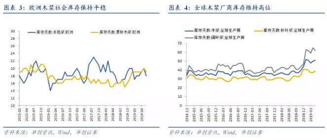 歐洲紙漿庫存保持平穩。截至2019年6月底,歐洲本色木漿和漂白針葉木漿庫存分別為18天和19天,保持總體穩定;截至2019年5月底,全球漿廠木漿庫存為51天,環比增加1天。從細分漿種來看(1)闊葉漿廠商木漿庫存為62天,較上月減少3天;(2)針葉漿廠商木漿庫存為39天,較上月增加2天。