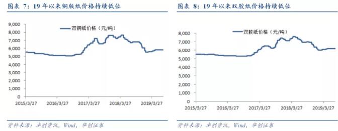 (二)雙膠和銅版等木漿系紙市場持續低迷,庫存未明顯去化 截至8月9日,雙膠紙價格為6192元/噸,環比下降0.13%;銅版紙價格為5833元/噸,與7月價格持平。18年9月中旬以來成品紙市場低迷,銅版和雙膠紙等木漿系紙由于終端低迷,中間環節貿易商及印刷廠主動減少采購,紙廠成品紙庫存累積導致紙價下跌,隨著紙價低迷及成品紙庫存提升,紙廠減少紙漿采購,紙漿貿易商港口庫存累積。