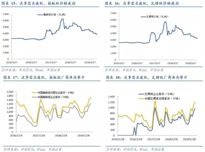 木漿系產業鏈庫存仍待去化,廢紙系產業鏈庫存調整尚需時日 木漿系產業鏈:成品紙價格的調整,貿易商木漿庫存高位延續,7月底青島港木漿庫存達到130萬噸,常數港木漿庫存達到78.8萬噸,兩港庫存均創新高。短期針葉漿外盤價格略有回升,闊葉漿外盤價格持續下行,港口高庫存驅動現貨價格下行。 廢紙系產業鏈: 去年9月以來隨著下游需求疲弱,廠商持續去化廢紙及成品紙庫存,7月底廠商黃板紙庫存達到5.38天,箱板瓦楞紙7月價格下跌,市場需求持續疲軟,需求疲軟致使前期價格序列調整,行業庫存持續攀高,產業鏈庫存調整尚需時日。