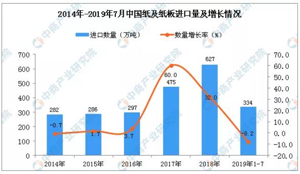 2019年1-2季度中國紙及紙板進口量有所增長,2019年1-7月中國紙及紙板進口量為334萬噸,同比下降8.2%。