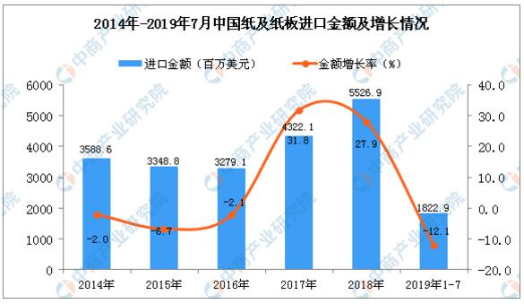 從金額方面來看,2019年1-7月中國紙及紙板進口金額為1822.9百萬美元,同比下降12.1%。