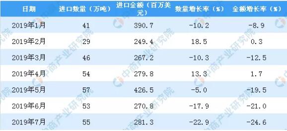 2019年1-7月中國紙及紙板進口數量及金額增長率情況