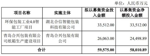 合興包裝9月4日召開(kāi)的董事會(huì)決議,使用公開(kāi)發(fā)行可轉(zhuǎn)換公司債券募集資金,向湖北合信增資3.35億元,用于“環(huán)保包裝工業(yè)4.0智能工廠建設(shè)項(xiàng)目”,向青島合興增資2.45億元,用于“青島合興包裝有限公司紙箱生產(chǎn)建設(shè)項(xiàng)目”。 合興包裝通過(guò)可轉(zhuǎn)債募集近6億元 經(jīng)中國(guó)證券監(jiān)督管理委員會(huì)《關(guān)于核準(zhǔn)廈門(mén)合興包裝印刷股份有限公司公開(kāi) 發(fā)行可轉(zhuǎn)換公司債券的批復(fù)》(證監(jiān)許可[2019]974號(hào))核準(zhǔn),合興包裝已向社會(huì)公眾公開(kāi)發(fā)行了595.75萬(wàn)張可轉(zhuǎn)換公司債券,每張面值100元,期限6年。募集資金總額為人民幣5.96億元,扣除本次發(fā)行費(fèi)用人民幣1564.1萬(wàn)元,公司實(shí)際募集資金凈額為人民幣5.8億元。上述募集資金到位情況已經(jīng)立信會(huì)計(jì)師事務(wù)所(特殊普通合伙)驗(yàn)證,并出具了“信會(huì)師報(bào)字[2019]第ZB11881號(hào)”《驗(yàn)資報(bào)告》。 募集資金將用于湖北合信和青島合興項(xiàng)目 合興包裝表示,結(jié)合本次實(shí)際募集資金凈額情況,對(duì)募集資金具體投向擬作如下安排: