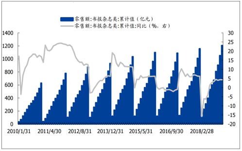 數據來源:公共資料整理 4.預計未來需求增長平穩,供求保持平衡狀態。 文化紙終端對應圖書印刷、教材出版、辦公用紙等需求,需求較為穩定。雜志類社零額維持較為穩定的低個位數增長,2015~2018年CAGR為3.1%,2018年增速雖較2017年有所放緩,但仍有4.3%的增長。2018年宏觀經濟承壓,雙膠/銅版紙表觀需求量增速下滑至2.6%/1.2%,但仍維持正增長,預計未來仍維持個位數增長,因此預計未來文化紙供求維持平衡。 2018年書報雜志類社零額同比增長4.3%