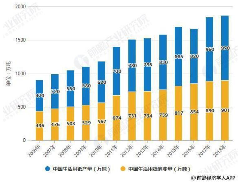 數(shù)據(jù)來源:前瞻產(chǎn)業(yè)研究院整理 中國(guó)生活用紙需求端表現(xiàn)穩(wěn)健 生活用紙作為必選消費(fèi)品,需求端表現(xiàn)穩(wěn)健。2018年造紙行業(yè)整體需求疲軟,國(guó)內(nèi)紙及紙板產(chǎn)銷分別同比下降6.2%、4.2%;但生活用紙仍然保持穩(wěn)健增長(zhǎng),2018年產(chǎn)量為970萬噸,同比增長(zhǎng)1%;消費(fèi)量901萬噸,同比增長(zhǎng)1.2%。 2006-2018年中國(guó)生活用紙產(chǎn)銷量統(tǒng)計(jì)情況