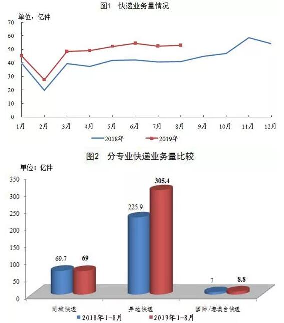 1-8月份,郵政服務(wù)業(yè)務(wù)總量累計(jì)完成1568.8億元,同比增長21.1%;郵政寄遞服務(wù)業(yè)務(wù)量累計(jì)完成160.1億件,同比增長1.5%;郵政寄遞服務(wù)業(yè)務(wù)收入累計(jì)完成272.4億元,同比增長8.9%。 8月份,郵政服務(wù)業(yè)務(wù)總量完成194.1億元,同比增長27.2%;郵政寄遞服務(wù)業(yè)務(wù)量完成20.5億件,同比增長4.4%;郵政寄遞服務(wù)業(yè)務(wù)收入完成32億元,同比增長17.6%。 1-8月份,全國快遞服務(wù)企業(yè)業(yè)務(wù)量累計(jì)完成383.1億件,同比增長26.6%;業(yè)務(wù)收入累計(jì)完成4621.8億元,同比增長24.4%。其中,同城業(yè)務(wù)量累計(jì)完成69億件,同比下降1.1%;異地業(yè)務(wù)量累計(jì)完成305.4億件,同比增長35.2%;國際/港澳臺業(yè)務(wù)量累計(jì)完成8.8億件,同比增長25.5%。 8月份,全國快遞服務(wù)企業(yè)業(yè)務(wù)量完成53億件,同比增長29.3%;業(yè)務(wù)收入完成616.8億元,同比增長26.2%。 1-8月份,同城、異地、國際/港澳臺快遞業(yè)務(wù)量分別占全部快遞業(yè)務(wù)量的18%、79.7%和2.3%;業(yè)務(wù)收入分別占全部快遞收入的10.3%、52.9%和10%。與去年同期相比,同城快遞業(yè)務(wù)量的比重下降5個(gè)百分點(diǎn),異地快遞業(yè)務(wù)量的比重上升5個(gè)百分點(diǎn),國際/港澳臺業(yè)務(wù)量的比重基本持平。