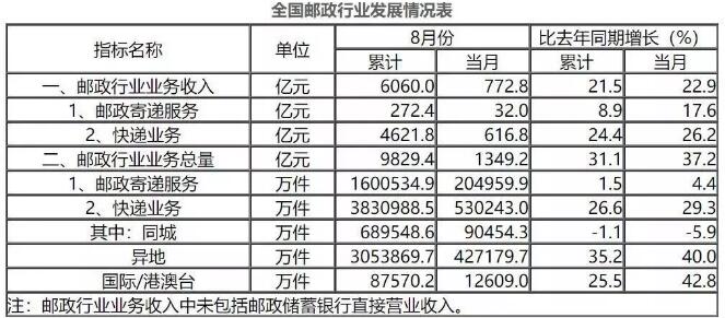 日前,國家郵政局發(fā)布行業(yè)最新數(shù)據(jù)。1-8月份,郵政行業(yè)業(yè)務(wù)收入(不包括郵政儲蓄銀行直接營業(yè)收入)累計(jì)完成6060億元,同比增長21.5%;業(yè)務(wù)總量累計(jì)完成9829.4億元,同比增長31.1%。 8月份,全行業(yè)業(yè)務(wù)收入完成772.8億元,同比增長22.9%;業(yè)務(wù)總量完成1349.2億元,同比增長37.2%。