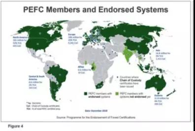 那么支持從塑料包裝轉(zhuǎn)換所需的纖維呢? 據(jù)國際模塑纖維協(xié)會報(bào)道,除紙板外,模塑纖維包裝在過去兩年中穩(wěn)步增長。食品服務(wù)項(xiàng)目和許多消費(fèi)者和家庭產(chǎn)品包現(xiàn)在用可生物降解的模塑纖維而不是塑料制成。隨著模塑纖維制造技術(shù)的進(jìn)步,成本降低和性能改進(jìn)將允許更多的包裝轉(zhuǎn)換成模制纖維,使用原始紙漿和再生紙漿。在競爭激烈的市場中,這將如何影響紙漿定價(jià)? 03、可持續(xù)纖維供應(yīng)的影響 為了滿足紙張和紙漿,而非塑料需求的增加,可能需要對新產(chǎn)能進(jìn)行資本投資。最可能的地區(qū)是具有良好纖維資源的區(qū)域,例如北歐國家、拉丁美洲、俄羅斯和北美。與纖維供應(yīng)相關(guān)的另一個(gè)考慮因素是蘋果和三星等公司打算從森林管理委員會(FSC)和森林認(rèn)證認(rèn)可計(jì)劃(PEFC)等組織定義的可持續(xù)管理森林中采購包裝材料。 圖4顯示了擁有PEFC/PEFC認(rèn)證森林成員的國家(陰影部分)包括全球3.09億公頃森林,但在一些地區(qū),只有不到一半的林地獲得認(rèn)證,并且不會被認(rèn)為可持續(xù)/可再生的公司從負(fù)責(zé)任管理的森林。這一要求將對環(huán)保包裝的纖維供應(yīng)造成額外壓力。
