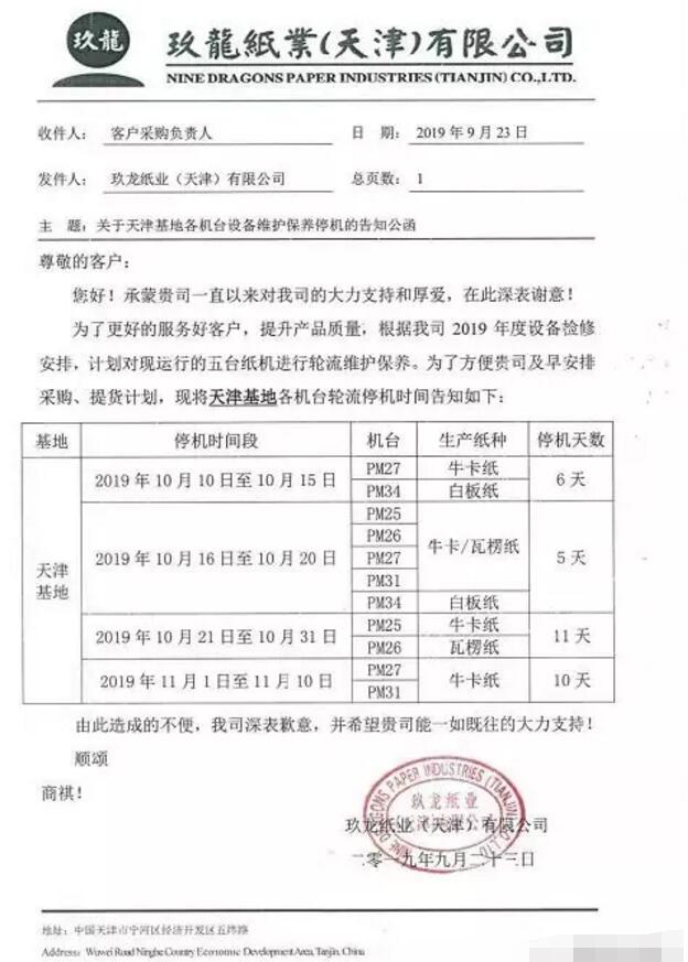 近段時間以來,原紙價格屢次上漲,加上天然氣等輔料成本上升,紙板漲價函蜂擁而至。上周五,浙江、廣西等地又有多家紙板廠宣布漲價。 此前不少紙板廠表示,紙板行業虧損嚴重,公司經營困難。某知名人士稱:現階段,上至造紙廠,下至紙板紙箱廠都處于虧損狀態,因此本輪漲價更多是屬于市場理性回歸。 值得一提的是,步入新的一周后,天津玖龍發布了停機單,宣布從10月10日起,五臺紙機將陸續停機。這也給市場造成一定影響,部分紙板廠對接下來的行情,可能會處于觀望狀態中。