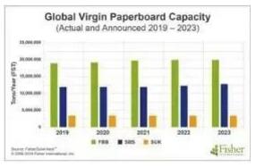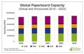 縱觀塑料飲料杯,用紙張替代全球10%的塑料杯,估計需要588,000噸杯子,比2019年全球產能350萬噸增加18%。目前,2019年之后沒有新的杯子產能宣布。 如果我們計算在美國和歐洲可能的替換塑料包裝,因為公眾對塑料廢物的關注仍在繼續,Fisher估計,用紙替代5%的塑料將消耗150萬噸紙。假設這一新產品是紙板(用于食品和飲料),下圖顯示這些品種在未來五年內實際和宣布的全球產能總量僅增加180萬噸。如果更廣泛地考慮紙板,包括回收品種,那么SmithersPira預計,到2022年,包裝紙板的需求將每年增長4%。