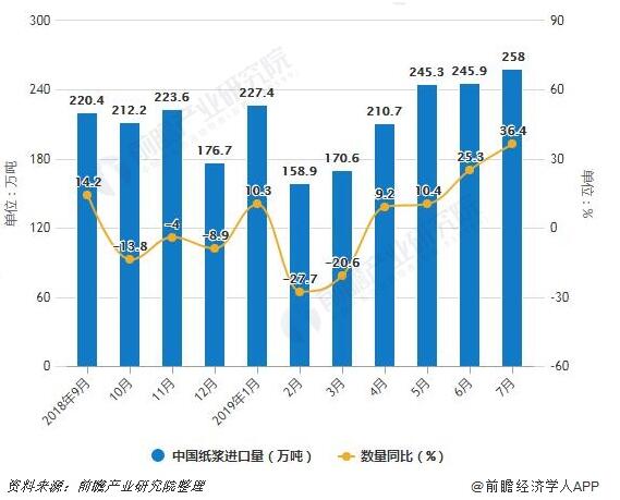 2018-2019年7月中國紙漿進口量、金額統計及增長情況