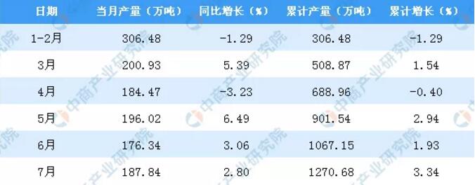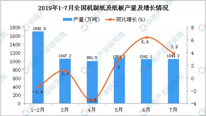 據(jù)中商產(chǎn)業(yè)研究院數(shù)據(jù)庫顯示,2019年1-2季度全國機(jī)制紙及紙板產(chǎn)量有所增長,2019年7月全國機(jī)制紙及紙板產(chǎn)量為1044.2萬噸,同比增長3.9%。2019年1-7月全國機(jī)制紙及紙板產(chǎn)量為7070.7萬噸,同比增長2.2%。根據(jù)中商情報(bào)網(wǎng)的數(shù)據(jù)統(tǒng)計(jì)了2019年1-7月全國部分省市的機(jī)制紙及紙板產(chǎn)能情況。其中廣東省在2019年1-7月機(jī)制紙及紙板產(chǎn)量最高,為1270.68萬噸,同比增長3.34%。 (▼2019年1-7月全國機(jī)制紙及紙板產(chǎn)量統(tǒng)計(jì)數(shù)據(jù))