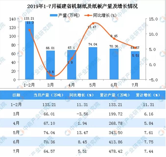 福建省 2019年1-2季度福建省機(jī)制紙及紙板產(chǎn)量有所增長,2019年7月福建省機(jī)制紙及紙板產(chǎn)量為64.57萬噸,同比增長5.51%。2019年1-7月福建省機(jī)制紙及紙板產(chǎn)量為478.42萬噸,同比增長7.44%。
