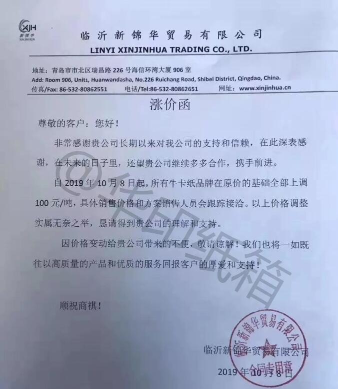 山東臨沂新錦華貿易有限公司:自10月8日起,所有牛卡紙品牌在原價的基礎上全部上調100元/噸,具體銷售價格請和方案請與銷售人員接洽。以上價格調整實屬無奈之舉。