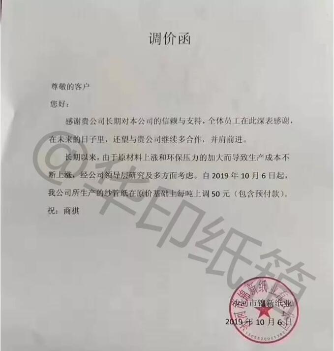 河北沙河市錦新紙業:長期以來,由于原材料上漲和環保壓力的加大而導致生產成本不斷上漲,經公司領導層研究及多方面考慮,自2019年10月6日起,我公司所生產的紗管紙在原價基礎上每噸上調50元(包含預付款)。