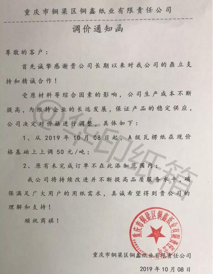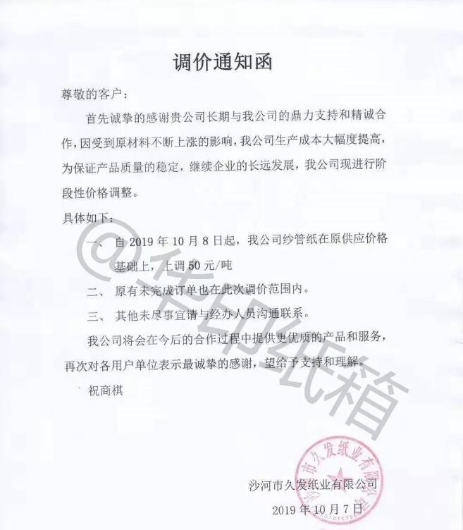 河北沙河市久發紙業:因受到原材料不斷上漲的影響,我公司生產成本大幅度提高,為保證產品質量的穩定,繼續企業的長遠發展,我公司現進行階段性價格調整。自2019年10月8日起,我公司紗管紙價格上調50元/噸。原有未完成訂單也在此次調價范圍內。