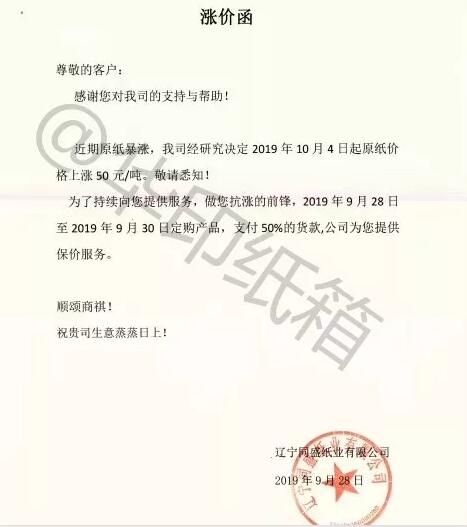 遼寧同盛紙業:近期原紙暴漲,我司研究決定自2019年10月4日起原紙價格上漲50元/噸。