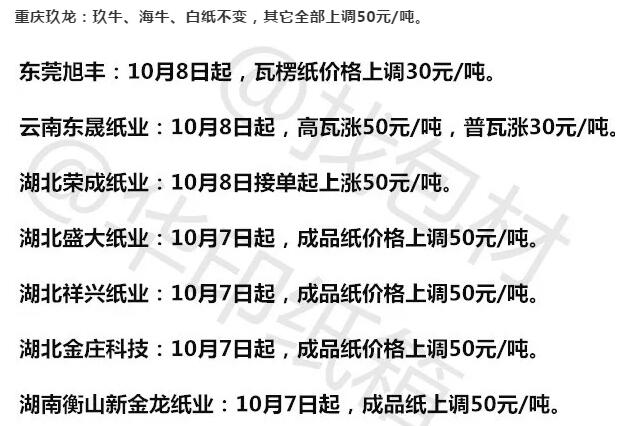 浙江省蘭溪市華圣紙業:因受各種原材料價格不斷持續上漲等因素的影響導致我司生產成本不斷上漲。公司研究決定從10月10日起成品紙價格在現有供應基礎上上調50元/噸。
