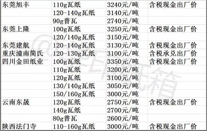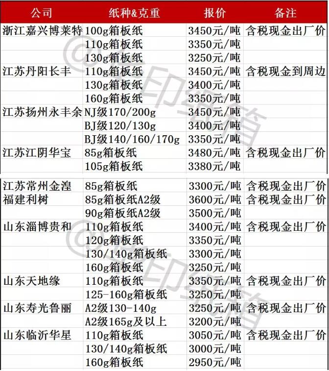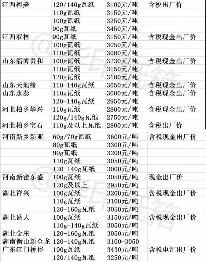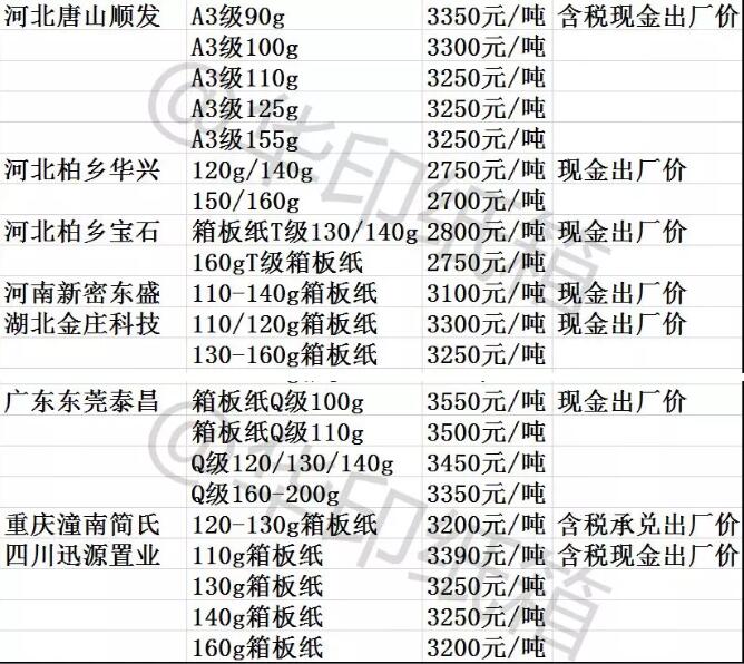廣東、浙江、河北、山東、湖北、湖南、重慶、云南、遼寧十幾家紙廠漲價,上調30-100元/噸
