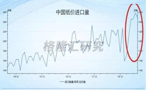 我們分析認為,18年紙價因為供不應求上漲迅猛,紙企加大產能力度,增加紙漿原料進口量,大量訂單到港,紙價卻在19年因為需求下滑迅速觸頂下跌: