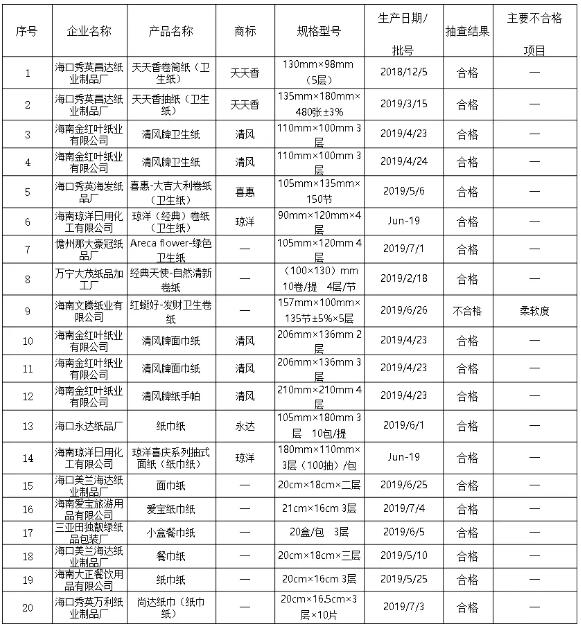 海南省市場(chǎng)監(jiān)督管理局網(wǎng)站發(fā)布《2019年生活用紙產(chǎn)品質(zhì)量省級(jí)監(jiān)督抽查結(jié)果公示》。信息顯示,2019年6月10日至8月6日,海南省市場(chǎng)監(jiān)督管理局組織對(duì)全省生活用紙產(chǎn)品進(jìn)行了省級(jí)監(jiān)督抽查。本次省級(jí)監(jiān)督抽查涉及13家生產(chǎn)企業(yè)20個(gè)批次樣品,抽檢生活用紙產(chǎn)品合格率為95%,檢出1個(gè)批次不合格,不合格產(chǎn)品檢出率5%。