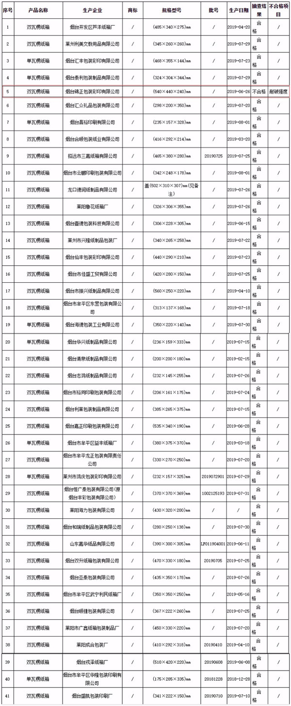 在本次抽查的3個大類、4個小類產品,共檢查了41家紙箱廠,其中有1家紙箱廠的1批次產品不符合相關標準的要求。產品不合格項目為耐破強度。具體情況如下: