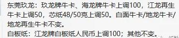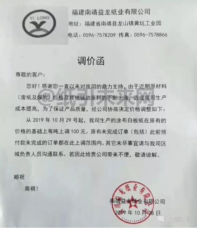 南靖益龍紙業:由于近期原材料(廢紙及煤炭)價格及其他輔助原料的不斷上漲,經公司協商決定價格調整如下:從2019年10月29號起,我司生產的涂布白板紙在原有的價格基礎上每噸上調100元。