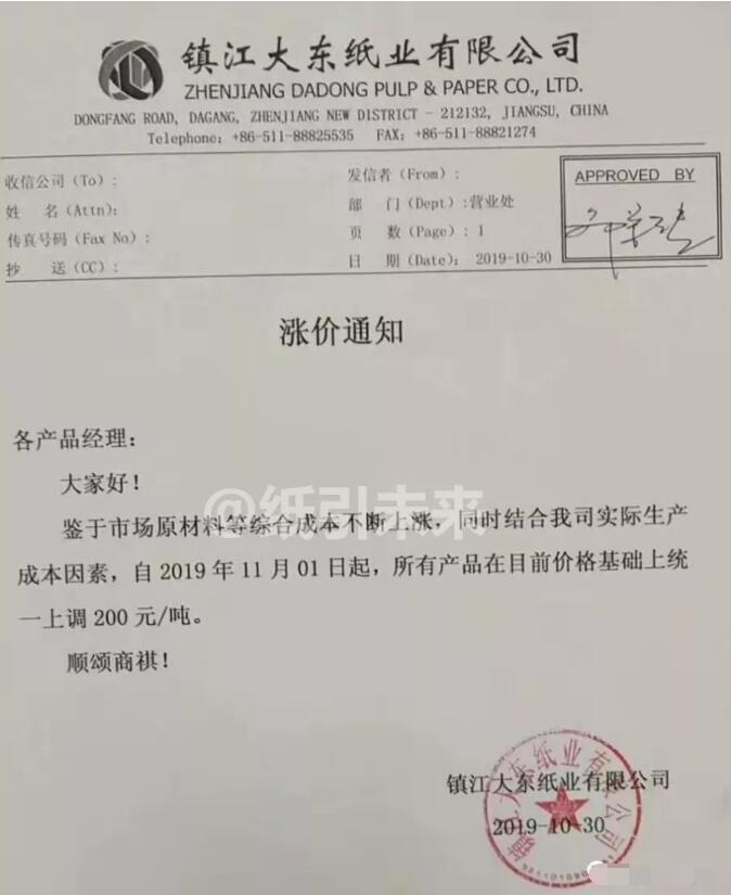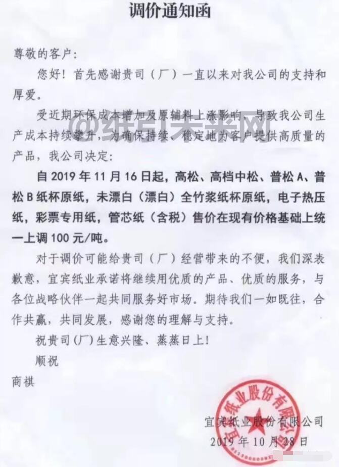宜賓紙業:受近期環保成本增加及原輔料上漲影響,導致我公司生產成本持續攀升,為確保持續、穩定地為客戶提供高質量的產品,我公司決定:自2019年11月16日起,高松、高檔中松、普松A、普松B紙杯原紙,未漂白(漂白)全竹漿紙杯原紙,電子熱壓紙,彩票專用紙,管芯紙(含稅)售價在現有價格基礎上統一上調100元/噸。