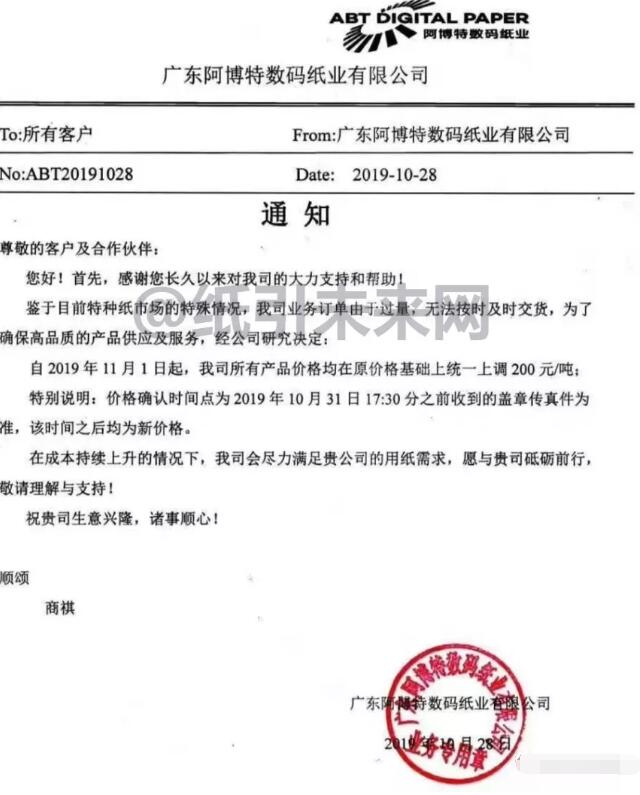 廣東阿博特數碼紙業有限公司:鑒于目前特種紙市場的特殊情況,自2019年11月1日起,我司所有產品價格均在原價格基礎上統一上調200元/噸。