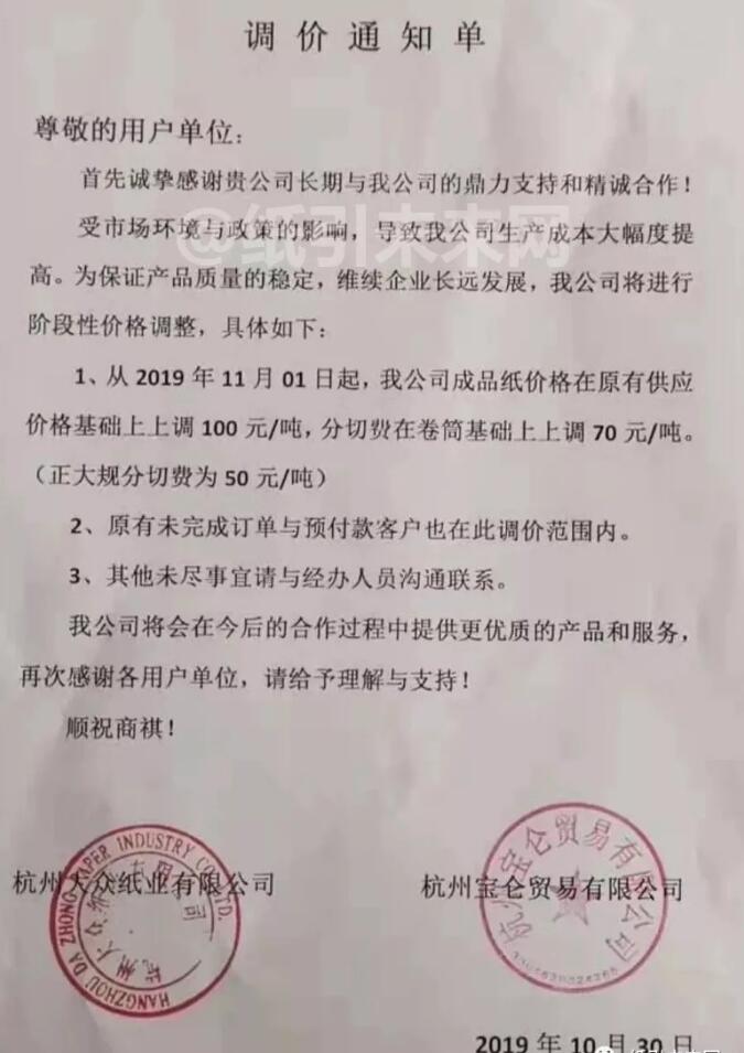 杭州大眾紙業:受市場環境與政策的影響,我司將進行階段性價格調整,具體如下:從2019年11月01日起,我公司成品紙價格在原有供應價格基礎上上調100元/噸,分切費在卷筒基礎上上調70元/噸。(正大規分切費為50元/噸)