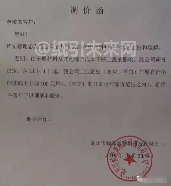 毫州市翰澤新材料科技:由于原材料及其他綜合成本不斷上漲的影響,經公司研究決定,從11月1日起,我公司工業紙板(雙灰、單白)在原有價格的基礎上上調100元每噸。