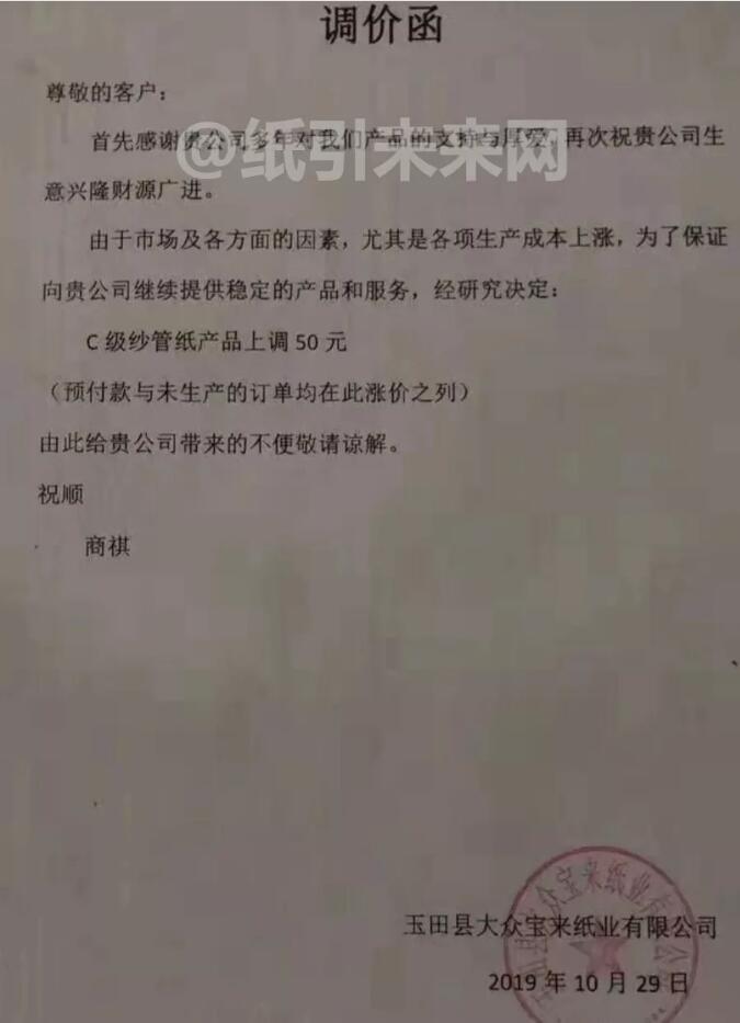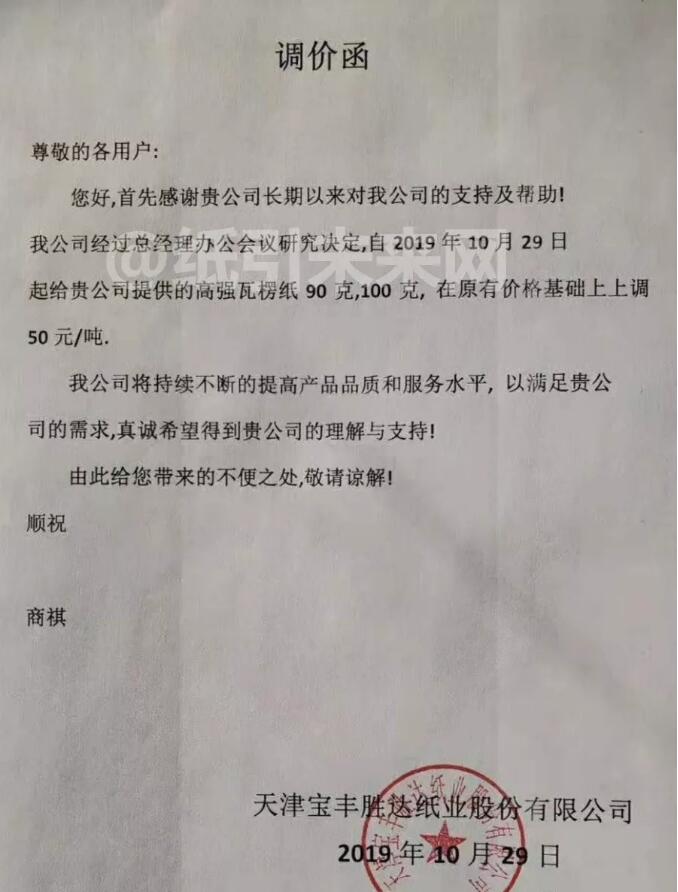 天津寶豐勝達紙業:我公司經過總經理辦公會議研究決定,自2019年10月29日是起給貴公司提供的高強瓦楞紙90克,100克,在原有價格基礎上上調50元/噸。