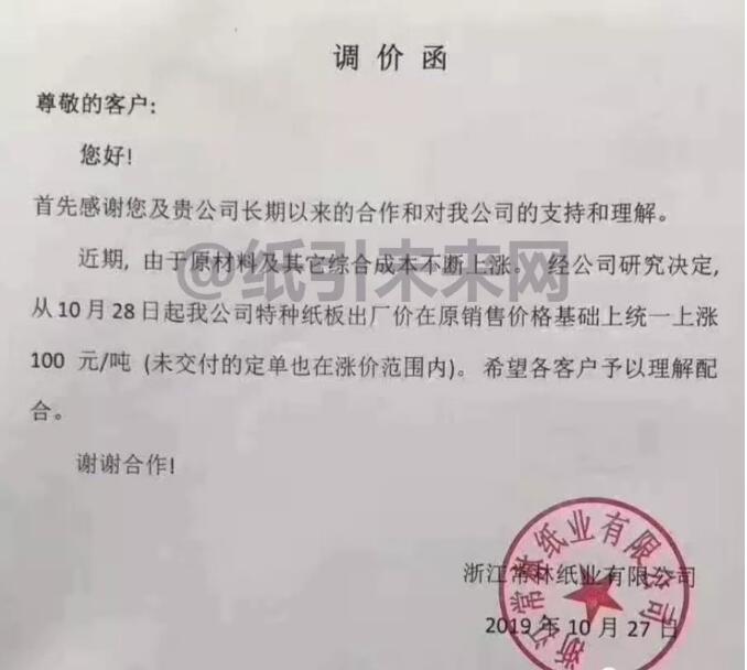 浙江常林紙業:由于原材料及其他綜合成本不斷上漲,經公司研究決定,從10月28日起我公司特種紙板出廠價基礎上統一上漲100元/噸(未交付的定單也在漲價范圍內)。