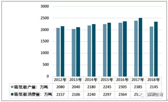 箱紙板主要用于家用電器、日用百貨、針棉織物、文化用品、中西成藥等的外包裝。2018年箱紙板生產(chǎn)量2145萬噸,較上年增長-10.06%;消費量2345萬噸,較上年增長-6.57%。2009~2018年生產(chǎn)量年均增長率2.42%,消費量年均增長率2.93%。 2012-2018年中國箱板紙產(chǎn)量與消費量統(tǒng)計