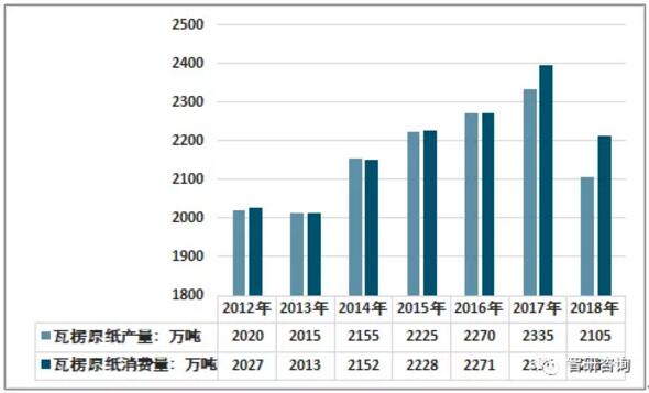 瓦楞原紙又稱瓦楞芯紙,是構(gòu)成瓦楞紙板波紋狀中芯所用的原料紙,主要用作瓦楞紙板的瓦楞芯層(中層),對瓦楞紙板的防震性能起重要作用,也可單獨用作易碎物品的包裝用紙。2018年瓦楞原紙生產(chǎn)量2105萬噸,較上年增長-9.85%;消費量2213萬噸,較上年增長-7.64%。2009~2018年生產(chǎn)量年均增長率2.30%,消費量年均增長率2.59%。 2012-2018年中國瓦楞原紙產(chǎn)量與消費量統(tǒng)計