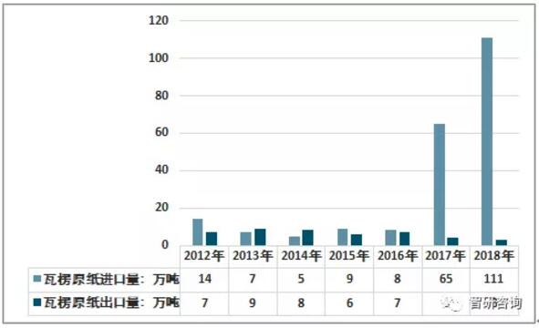 截止到2018年,中國瓦楞原紙進口量突破100萬噸,達到111萬噸,同比增長70.8%,出口量為3萬噸,同比降低25%。 2012-2018年中國瓦楞原紙進出口情況